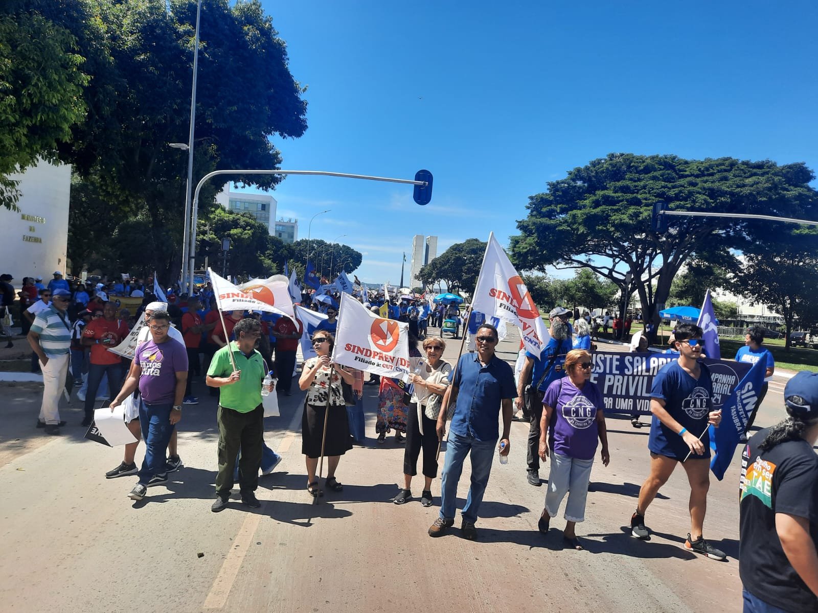 A concentração foi em frente a Catedral de Brasília e caminharam pela Esplanada dos Ministérios, onde pararam em frente ao Bloco K, sede do Ministério da Gestão e da Inovação em Serviços Públicos (MGI), onde os servidores e entidades pressionaram o governo pela reestruturação das carreiras, em defesa do reajuste para 2024, com o objetivo de recompor as perdas salariais dos governo Temer e Bolsonaro, a garantia de inclusão dos aposentados e pensionistas, em defesa de serviços públicos de qualidade.